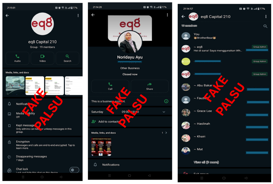 It has been brought to our attention that there is a possible investment scam being offered by a group of third-party individuals. The third-party individuals, unrelated to Kenanga Investors Berhad (“Kenanga Investors”) and/or its subsidiaries (collectively, “Kenanga Investors Group”), have been using the name and logo of Eq8 Capital Sdn Bhd (“Eq8”), a subsidiary of Kenanga Investors to promote illegal or unlicensed investment schemes through the WhatsApp application.