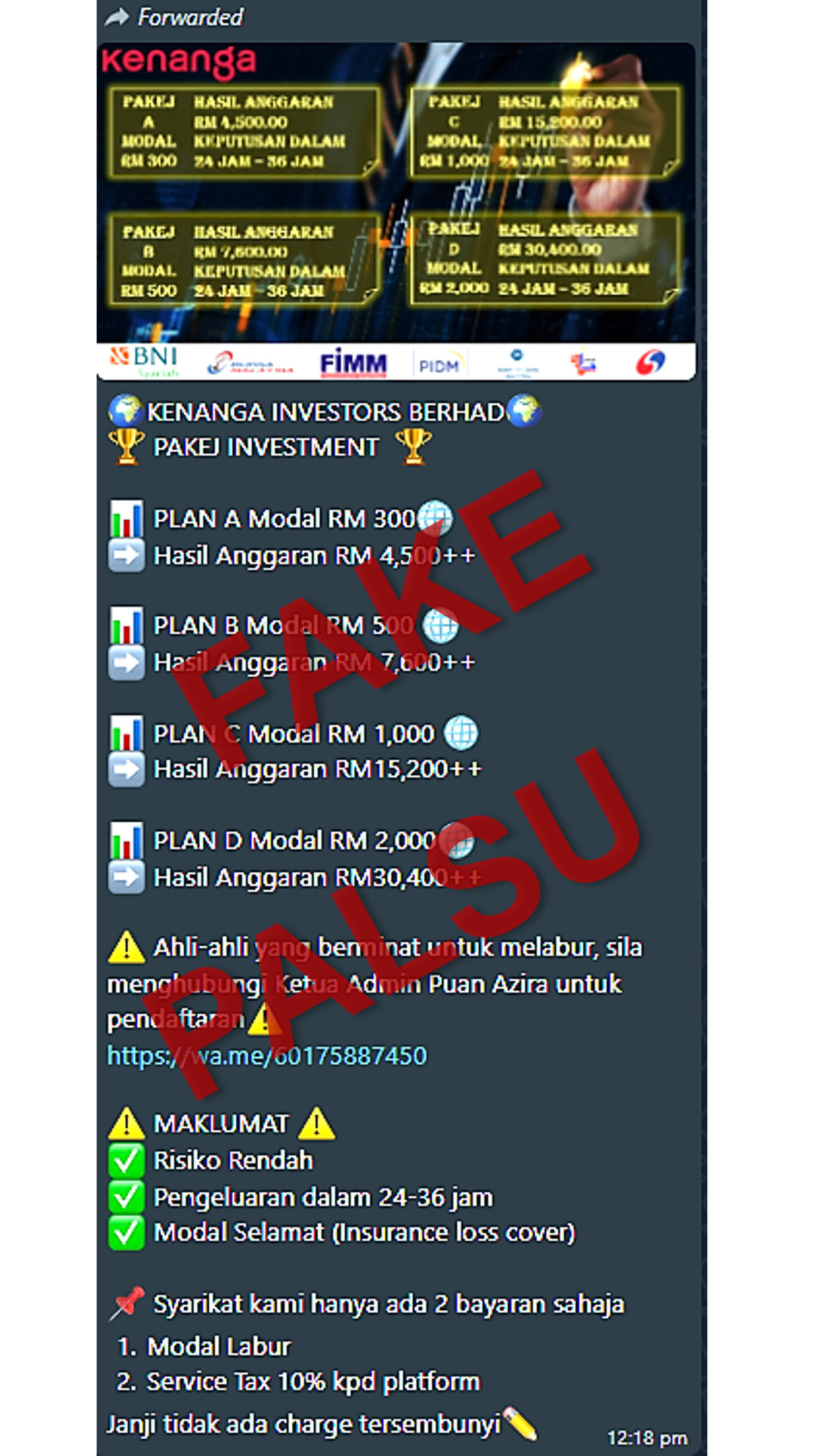 It has been brought to our attention that there is a possible investment scam being offered using the name and logo of Kenanga Investors Berhad (“Kenanga Investors”) through the WhatsApp application.