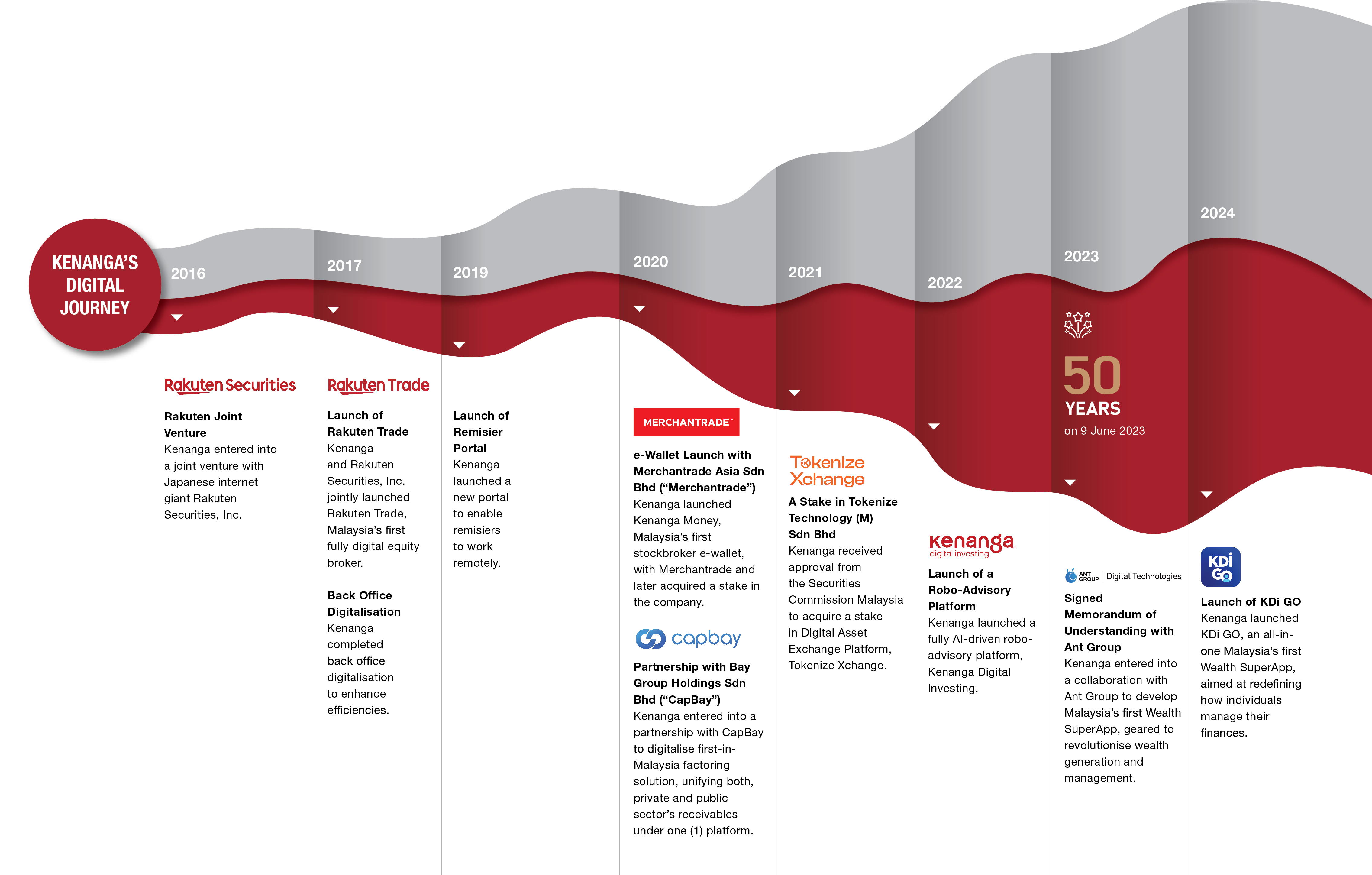 With a focus on delivering modern, accessible financial solutions, the Group continues to advance digital transformation in Malaysia's financial sector. Its subsidiaries have introduced game-changing solutions such as Rakuten Trade, Malaysia's first fully online stockbroking platform, and Kenanga Digital Investing, the country's first AI-powered robo-advisor. In 2024, the Group launched KDi GO, the nation's first Wealth SuperApp, designed to simplify and transform personal finance management.