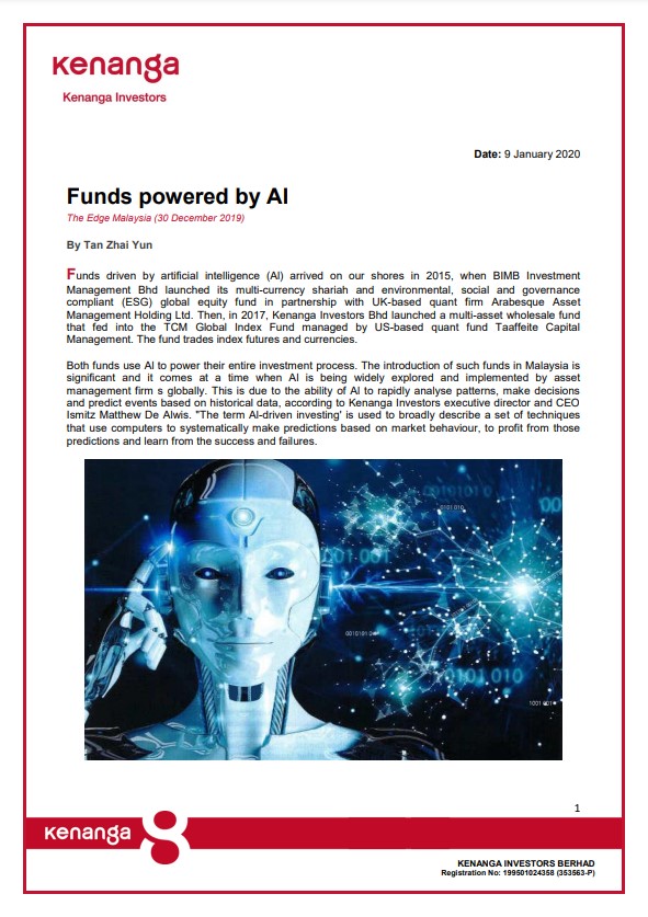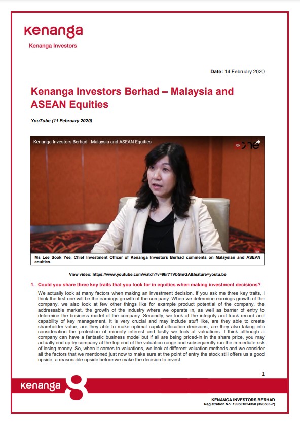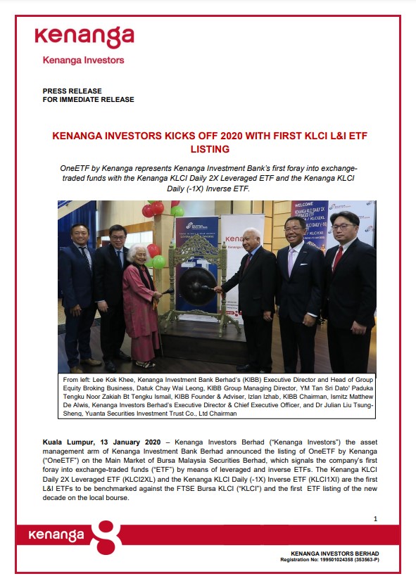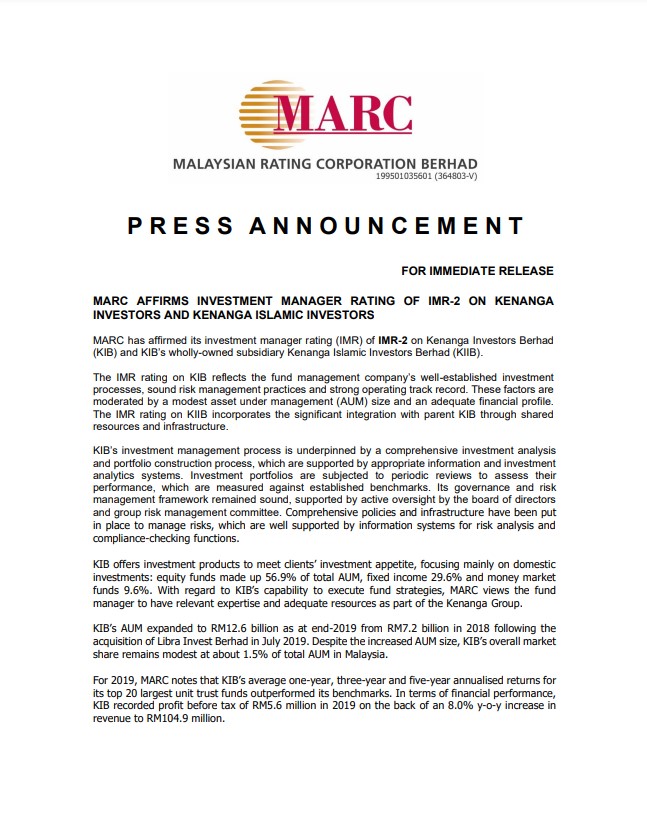 Kenanga Investors Berhad (KIB) and Kenanga Islamic Investors Berhad (KIIB) have been affirmed investment manager ratings (IMR) of IMR-2 by the Malaysian Rating Corporation Berhad (MARC) for the 4th consecutive year. The IMR rating reflects KIB’s well-established investment processes, sound risk management practices and strong operating track record as well as KIIB’s significant integration wi...