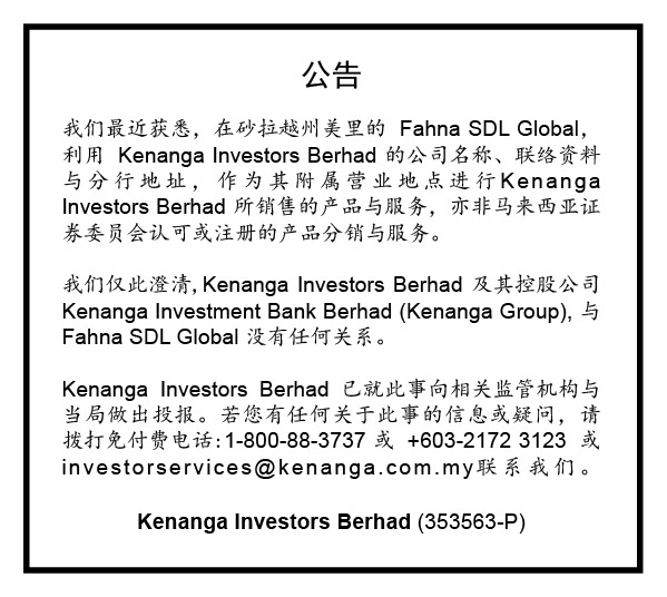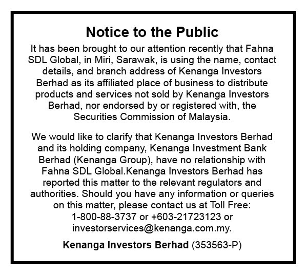 This is to inform the public that Fahna SDL Global, in Miri, Sarawak, is using the name, contact details, and branch address of Kenanga Investors as its affiliated place of business to distribute products and services not sold by Kenanga Investors Berhad, nor endorsed by or registered with, the Securities Commission of Malaysia. We would like to clarify that Kenanga Investors Berhad and its holding company, Kenanga Investment Bank Berhad (Kenanga Group), have no relationship with Fahna SDL Global. Kenanga Investors Berhad has reported this matter to the relevant regulators and authorities. Should you have information or queries on this matter, please contact us at Toll Free: 1-800-88-3737 or +603-21723123 or [email protected].