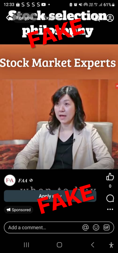 It has been brought to our attention that there is a video featuring Kenanga Investors Berhad (“KIB”) Chief Investment Officer (“CIO”), Ms Lee Sook Yee appearing on social media to influence and solicit investments.